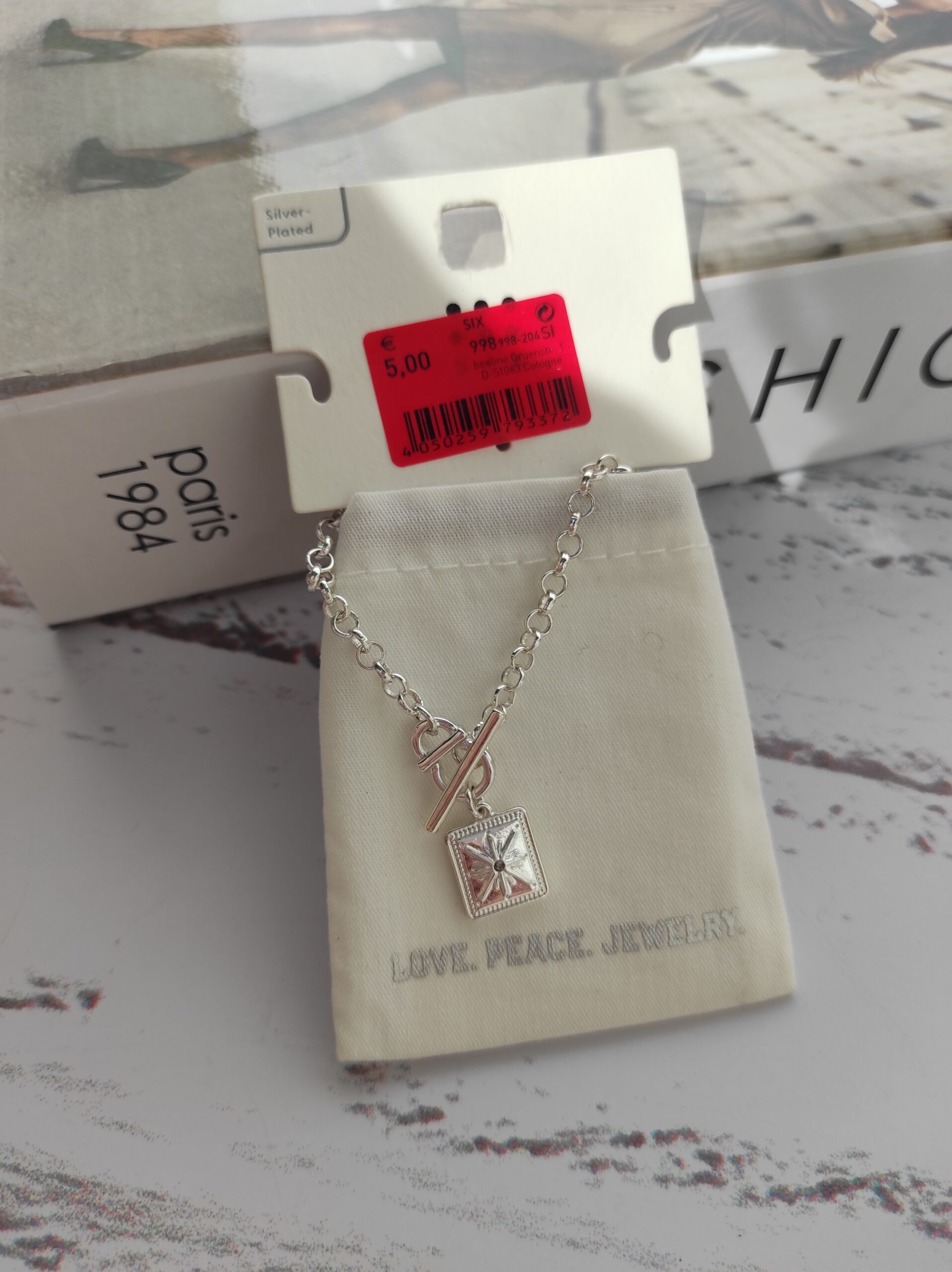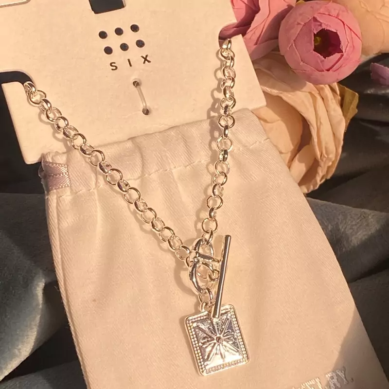 گردنبند قفلT ✔️رنگ ثابت ✔️زد حساسیت ✔️رنگ نقره ای (استیل) ✔️برند: six (وارداتی) ✔️سیلور ✅ بسیار شیک مناسب مهمونی ها و هدیه دادن 🔴هشدار: به دور از الکل و مواد شوینده